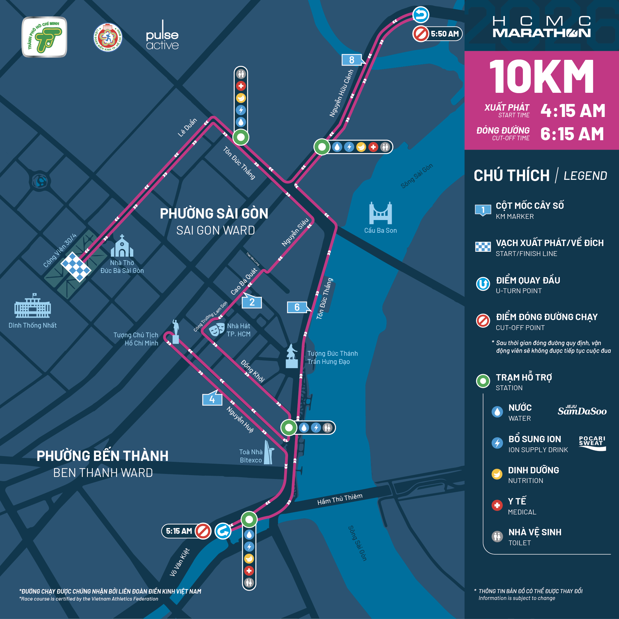 - Lưu ý rằng vì đường chạy HCMC Marathon sẽ được diễn ra ngay trong lòng thành phố, VĐV có thể gặp một số cản trở do đèn giao thông. Xin vui lòng thông cảm và tuân thủ hướng dẫn của nhân viên tổ chức để đảm bảo an toàn trong quá trình thi đấu.
